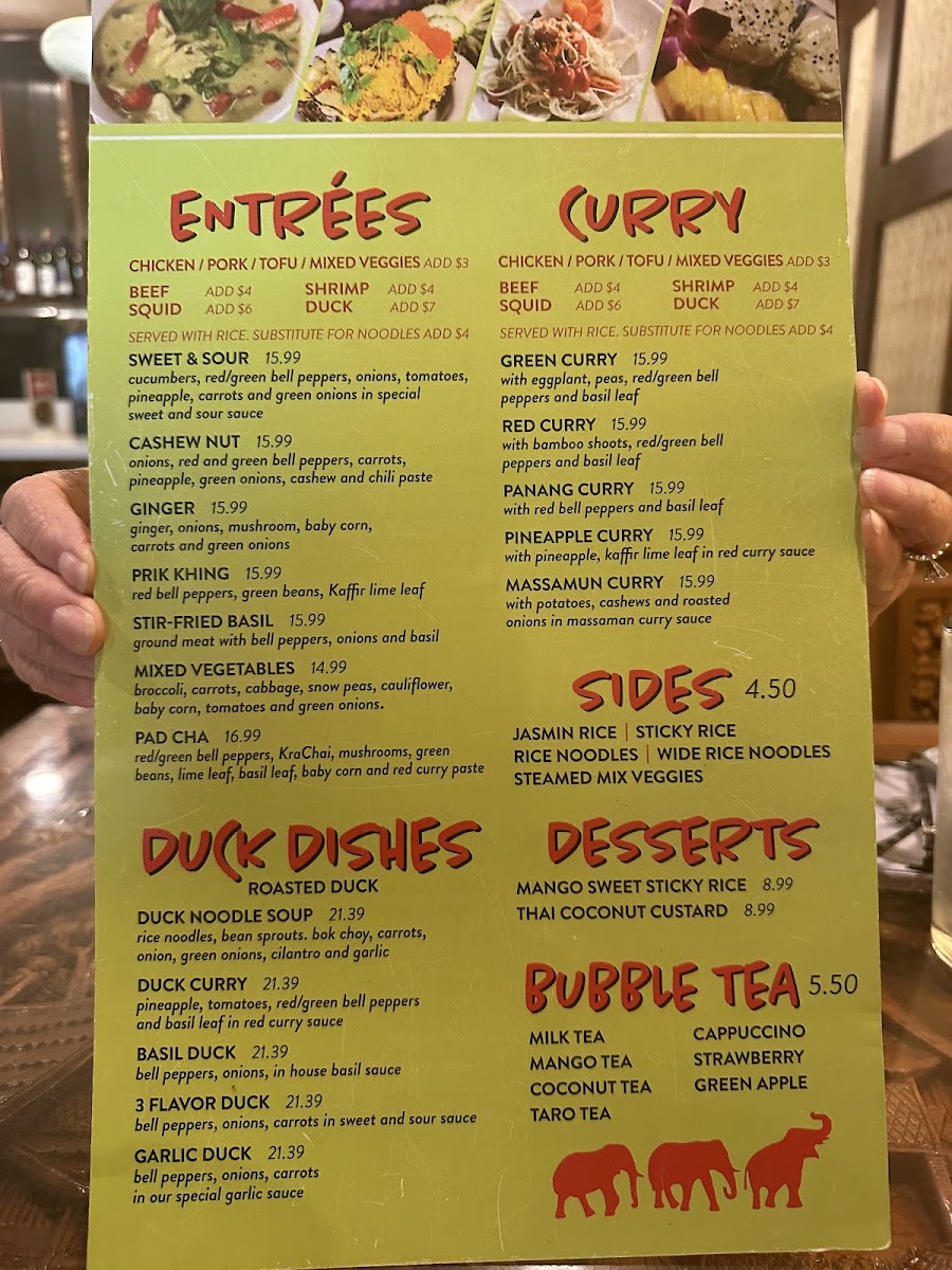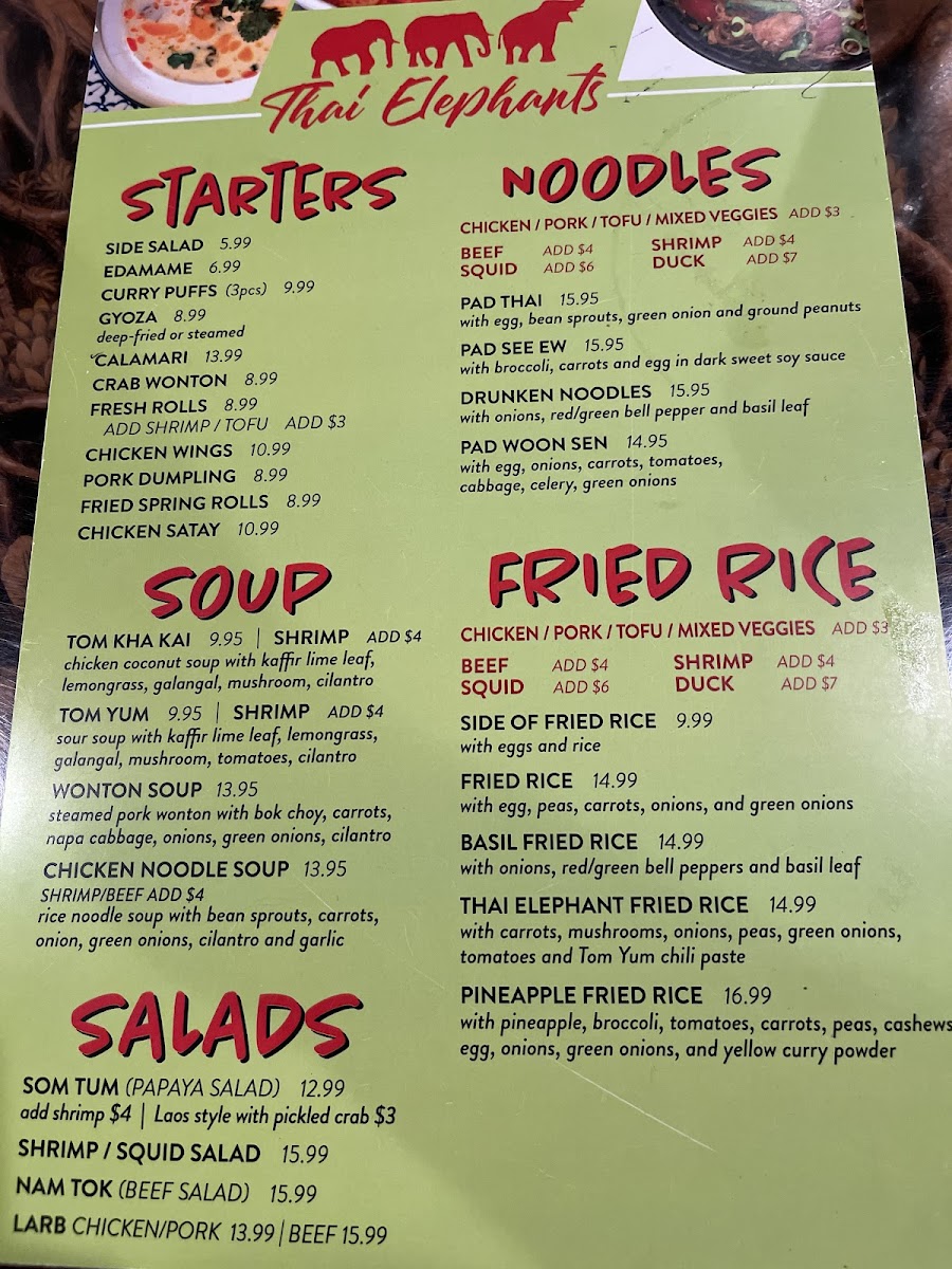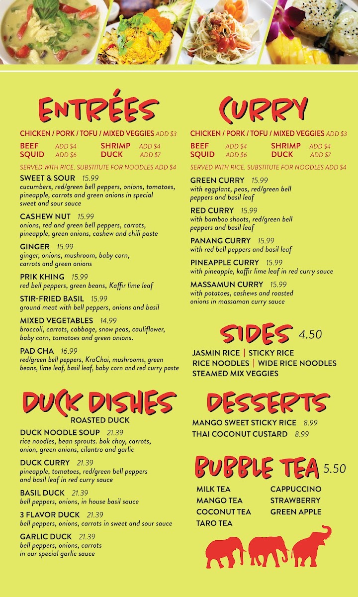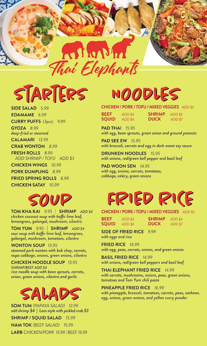 If you're craving a blend of bold flavors and comforting Thai dishes, the Thai Elephants Restaurant (James Island) Menu is just what you need. Located at 915 Folly Rd, Charleston, SC, this local gem serves up an incredible selection of authentic Thai cuisine that will leave your taste buds dancing. From rich curries and spicy stir-fries to fresh, vibrant salads, each dish is prepared with fresh ingredients and traditional spices that deliver the true essence of Thailand. Whether you're in the mood for a savory Pad Thai or a flavorful green curry, there's something on the menu for everyone. Pair your meal with a refreshing Thai iced tea, and you're in for a treat! The menu offers a variety of options, including vegetarian and gluten-free choices, so everyone can enjoy a delicious, satisfying meal. No matter what you choose, dining here promises an unforgettable Thai experience right in the heart of Charleston.
